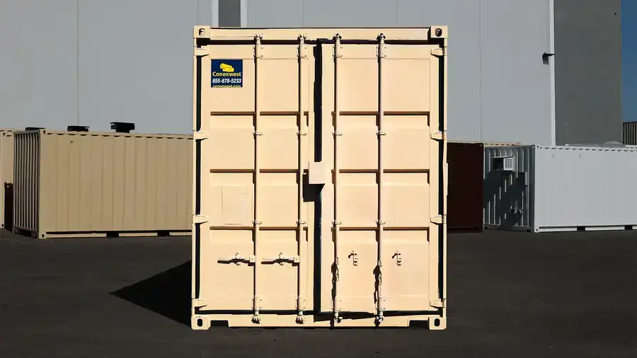 Each container undergoes a full professional refurbishment process, which includes exterior cleaning, minor repairs, surface preparation, and repainting with DTM (Direct-to-Metal) industrial-grade paint in a uniform RAL 1015 Light Beige color.
